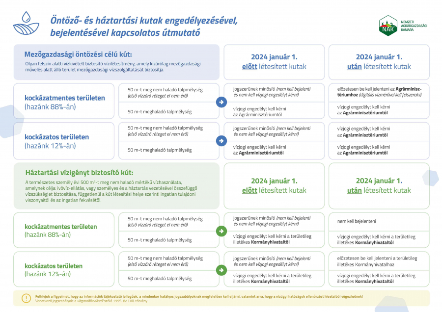 Az öntöző- és háztartási kutak engedélyezésével, bejelentésével kapcsolatos – a Nemzeti Agrárgazdasági Kamara által közzétett – útmutatót jelen tájékoztatásomhoz mellékelem.