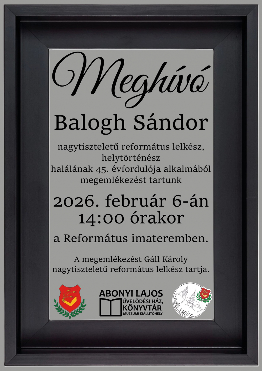 Az abonyi Református Imateremben emlékezünk meg Balogh Sándor nt református lelkészre most pénteken 14 órától, halálának 45. évfordulóján. A megemlékezést Gáll Károly református lelkész tartja.