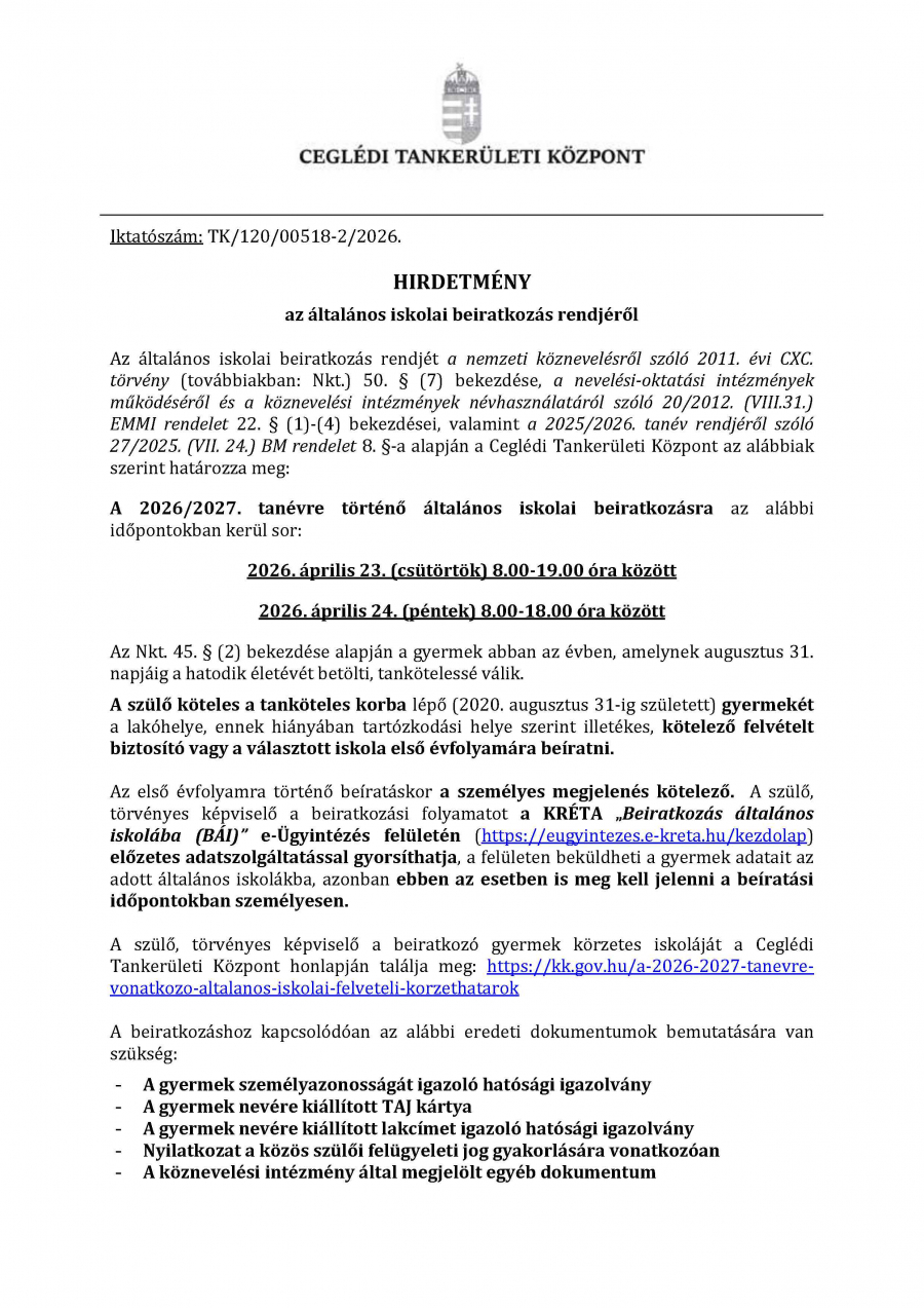 2026/2027. tanévre történő általános iskolai beiratkozásra az alábbi időpontokban kerül sor: